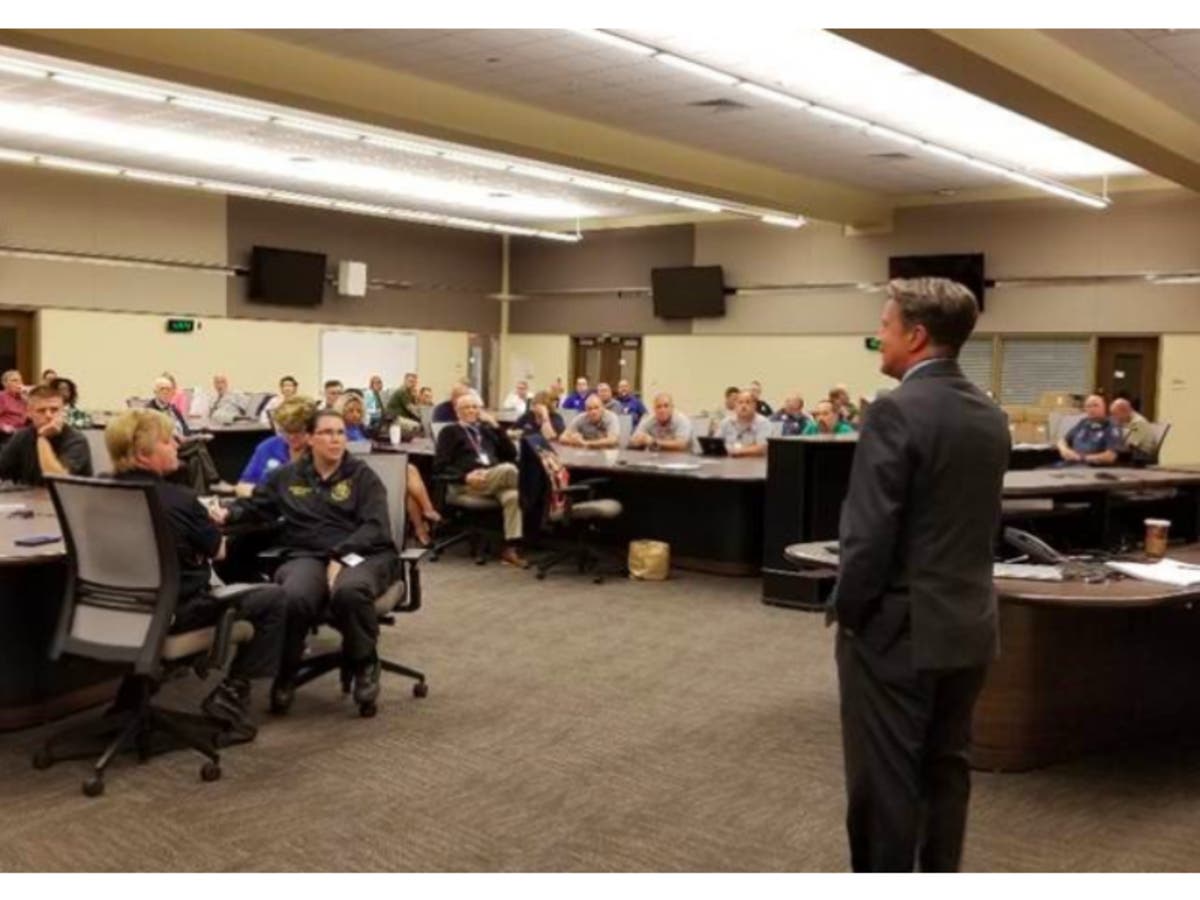 Pictured, Harford County Executive Barry Glassman addresses agency representatives gathered at the county’s emergency operations center Monday to prepare for the potential impact of Hurricane Florence. Photo courtesy of Harford County Government.
