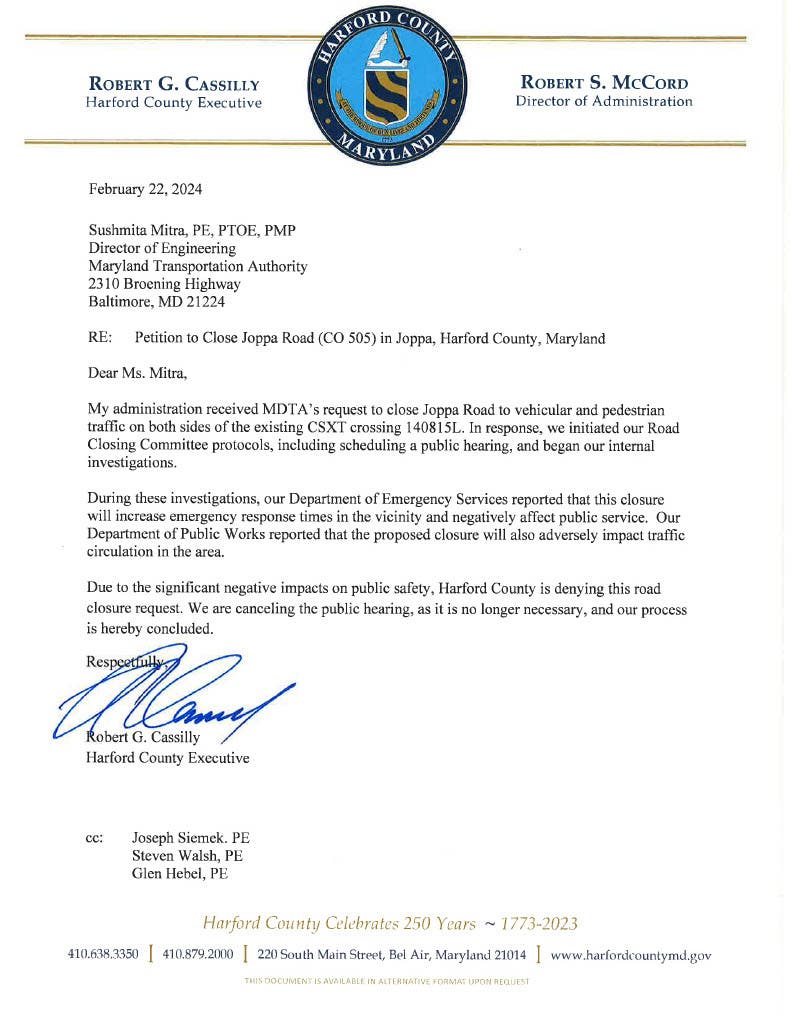 Harford County Executive Bob Cassilly on Thursday denied a request by Maryland Transportation Authority on behalf of CSX rail service to close Joppa Road on both sides of its railroad crossing in Joppa. The request was denied after investigations by the administration found that a closure of the crossing would slow emergency vehicle response times and impede general traffic circulation in the area.
