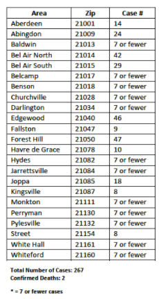 The most cases in the county are in the 20150 ZIP code (Forest Hill), which has 47 cases as of Wednesday, according to the Harford County Department.