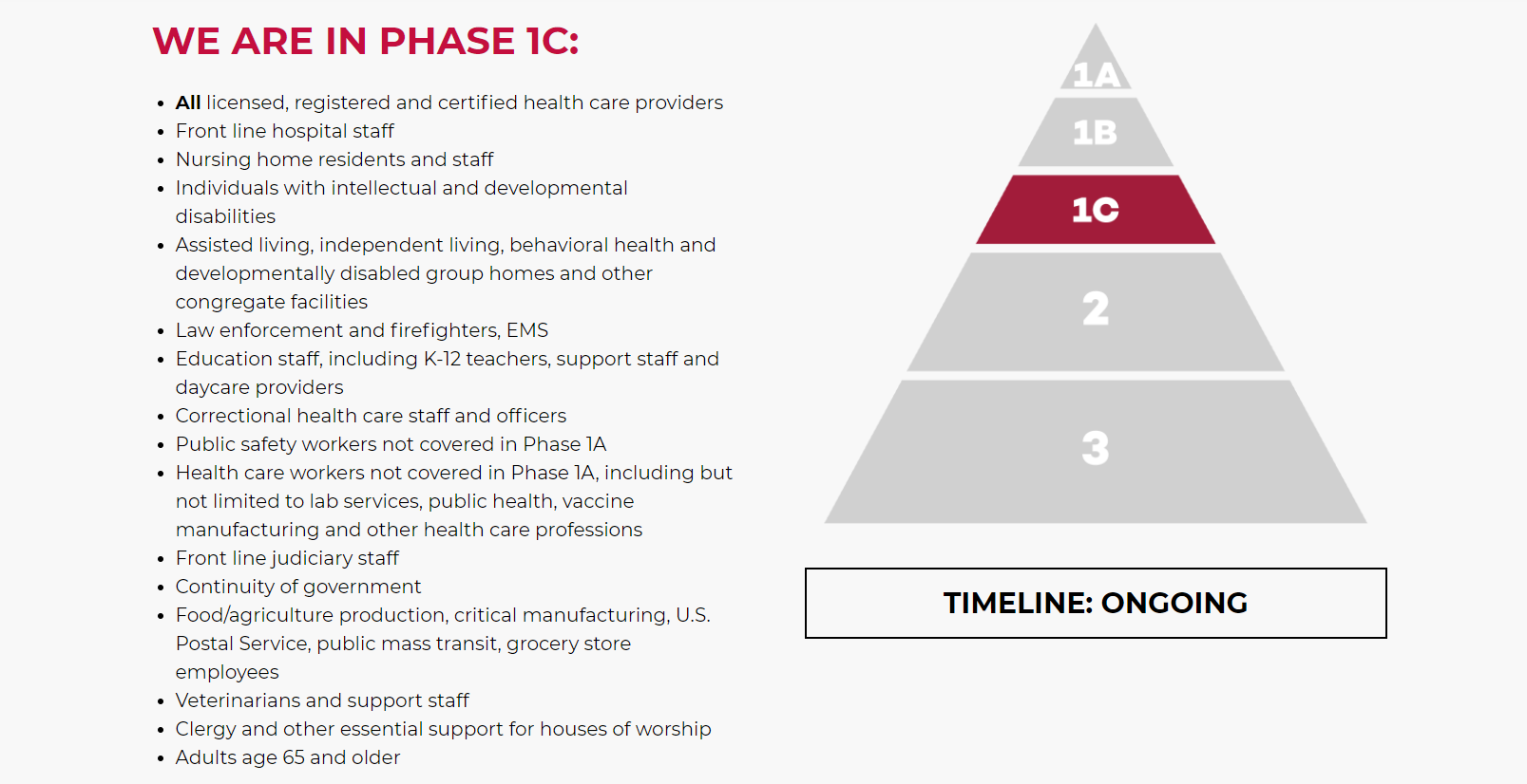 Around the state, authorities say vaccines may not be accessible to many in phase 1C for several weeks because the vaccine is in limited supply.