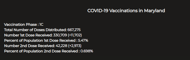 More than 42,000 people have gotten the second dose; that means almost 0.7 percent of Marylanders received the second dose of the vaccine, as the Moderna and Pfizer vaccines both require a booster shot.