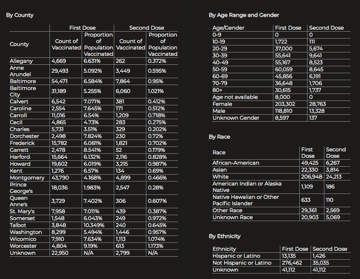 The Maryland Department of Health has created a COVID-19 vaccination locator tool that is designed to search for vaccines by ZIP code: covidvax.maryland.gov.