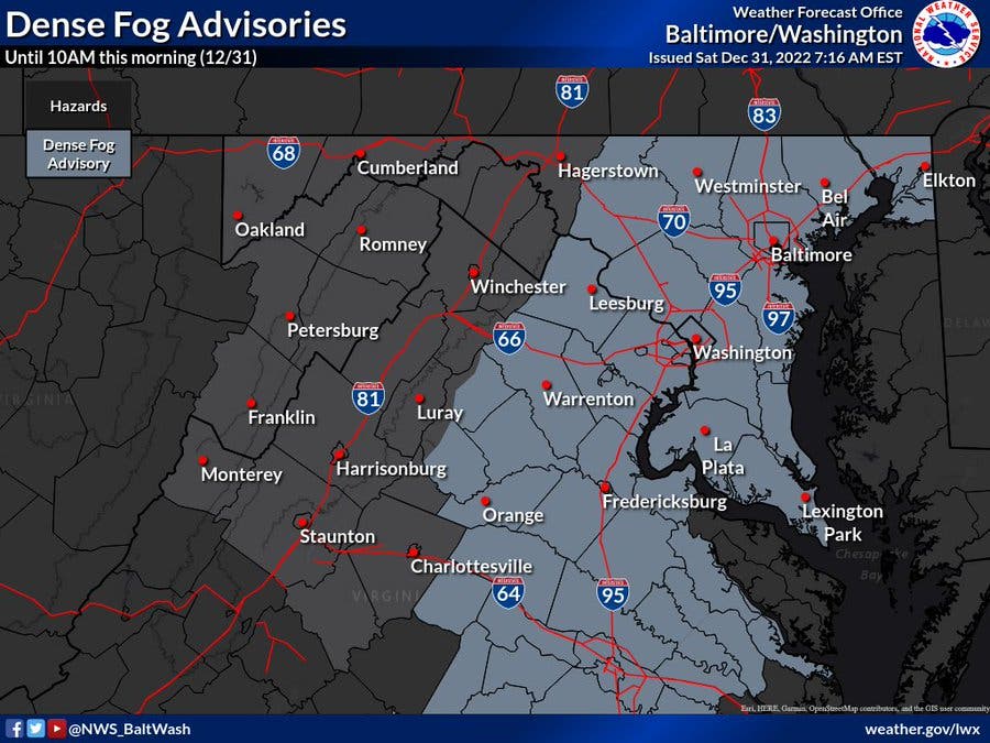 Dense fog has cut visibility across portions of Maryland and hampered driving. Rain should end late Saturday night.