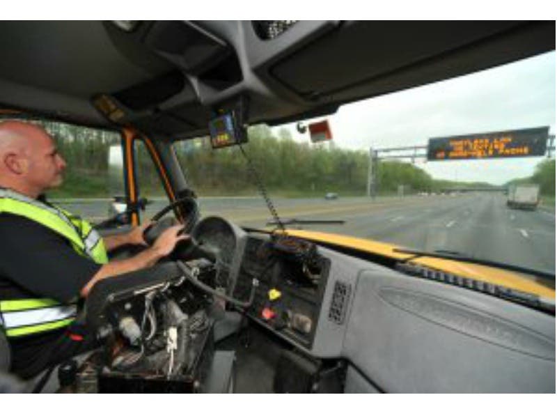Pictured, Sgt. Michael Smart drove a Maryland Transportation Authority dump truck on Wednesday, April 27, to check roads for distracted drivers. Photo Credit: Maryland State Police.