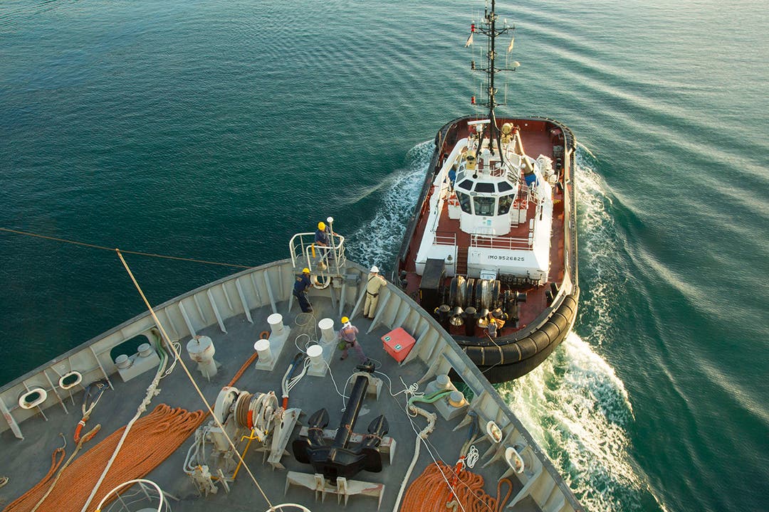 An Italian tugboat pulled the Cape Ray to the dock where she would receive chemical agents, according to the Edgewood Chemical Biological Center. Photo Credit: U.S. Navy Seaman Desmond Parks/Edgewood Chemical Biological Center.