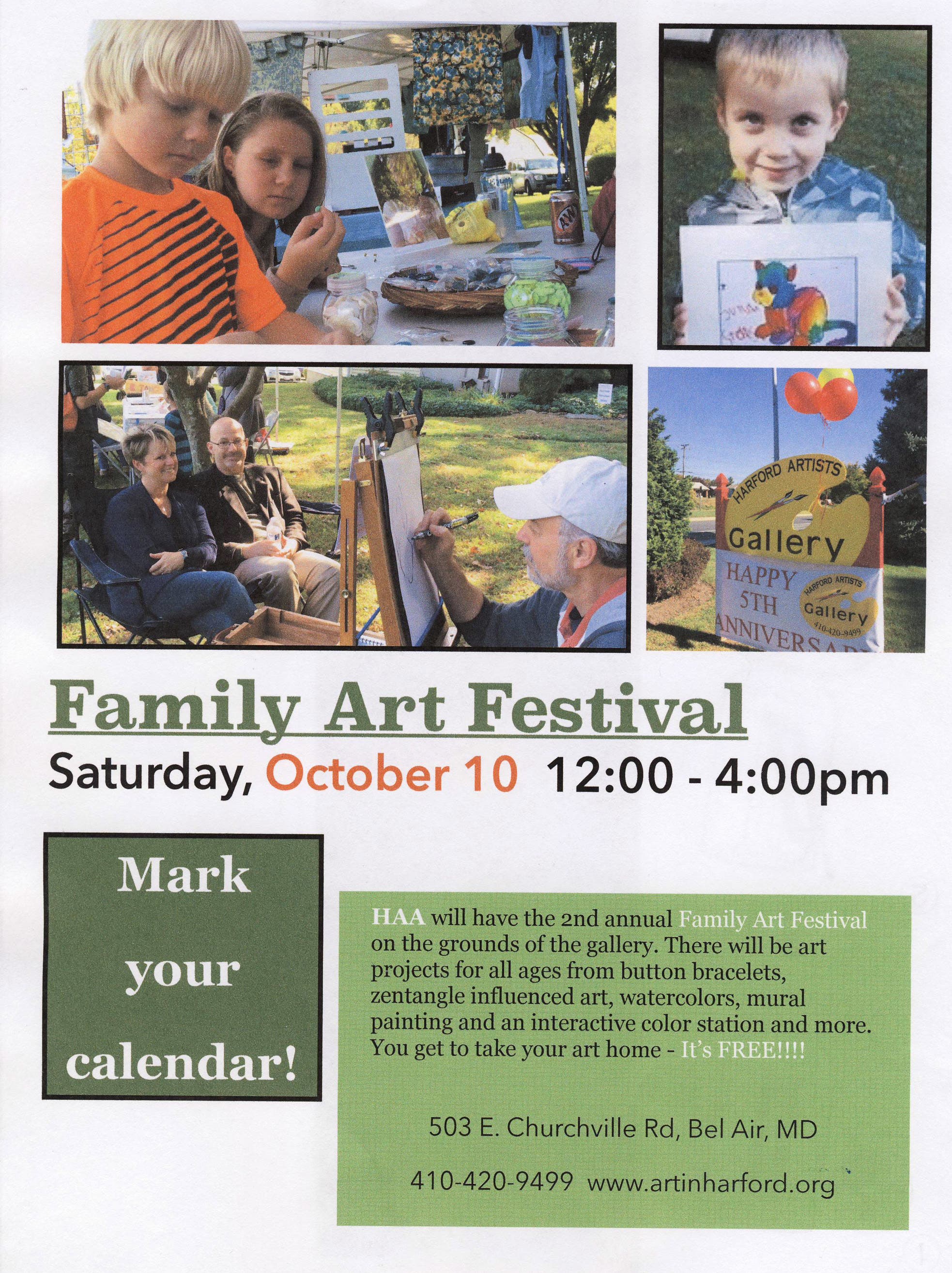 The Harford Artists’ Association will hold its 2nd annual Family Art Festival on the grounds of the gallery next to Rockfield Manor in Bel Air. There will be art projects for all ages from button bracelets, zentangle influenced art, watercolors, mural painting, an interactive color station, and more. You get to take your art home -- It’s FREE!