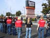 As Alanis Morissette's "Ironic" played throughout the restaurant, approximately 40 employees walked outside and formed a circle to begin their chants.