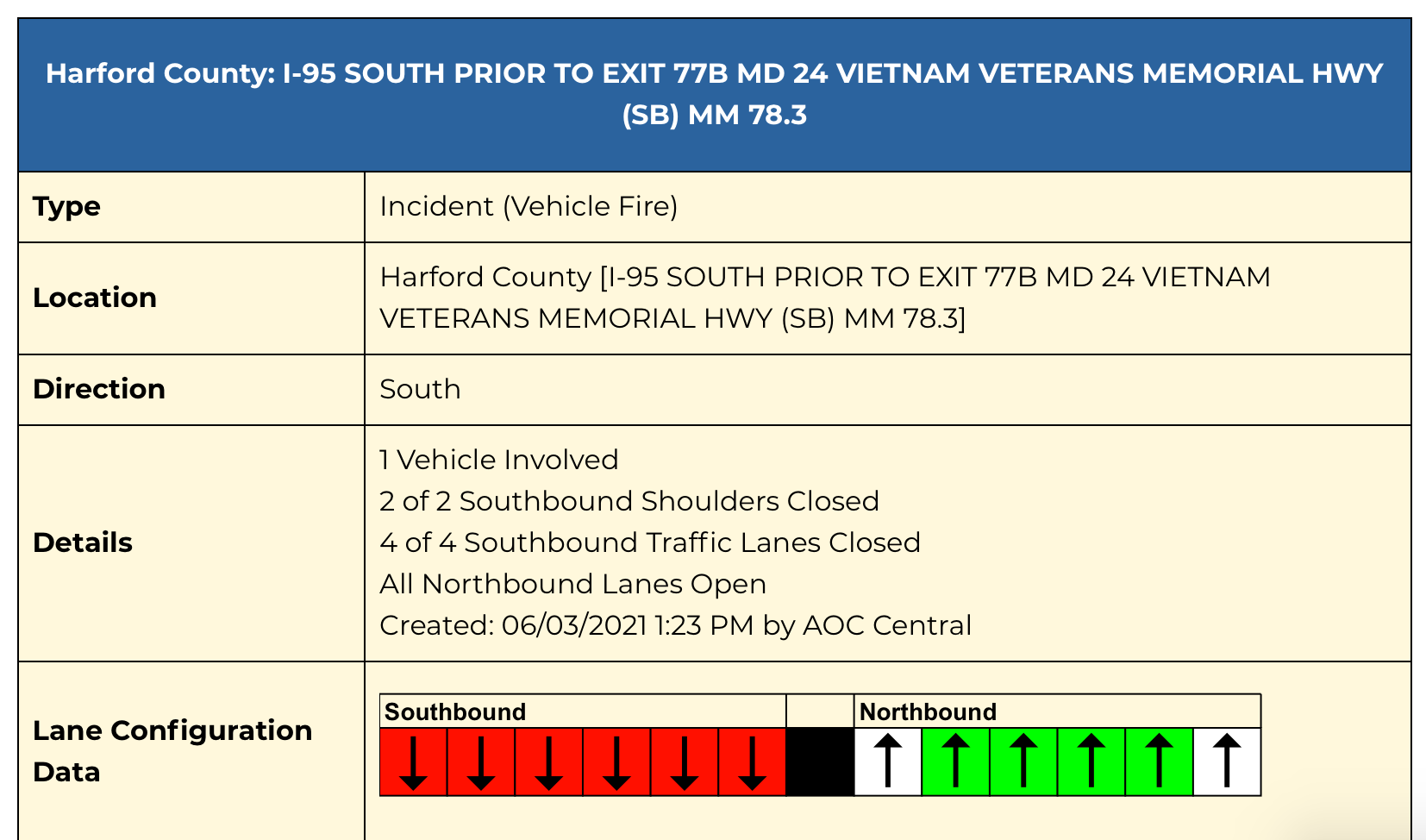 Vehicle Fire Closed I-95 South In Harford County: Officials
