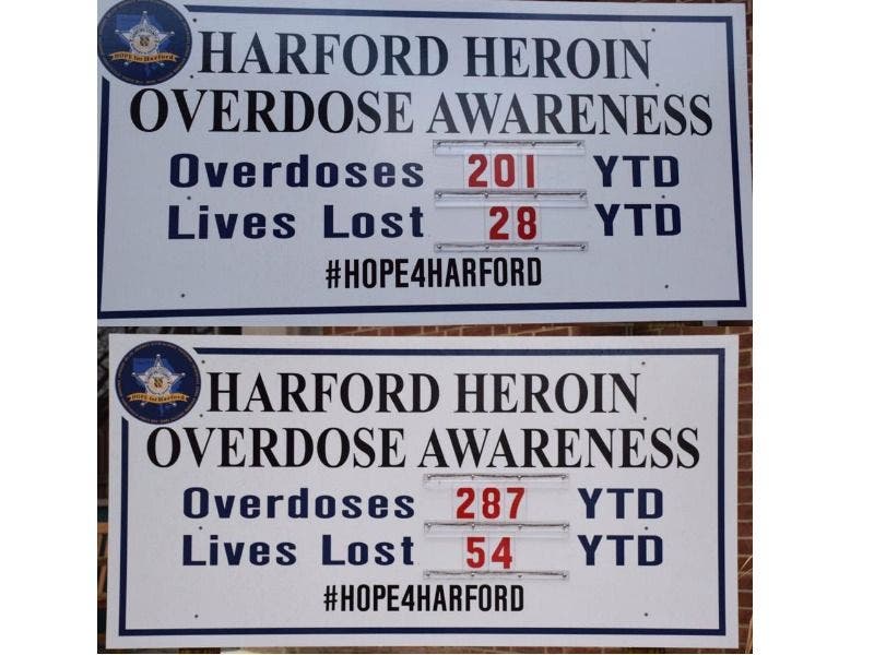 Harford County launched a public awareness campaign in 2016, among other initiatives to combat the heroin epidemic, winning national recognition for innovation. Each week, the sheriff's office updates signs outside its offices to reflect the number of fatal and nonfatal overdoses in Harford County.
