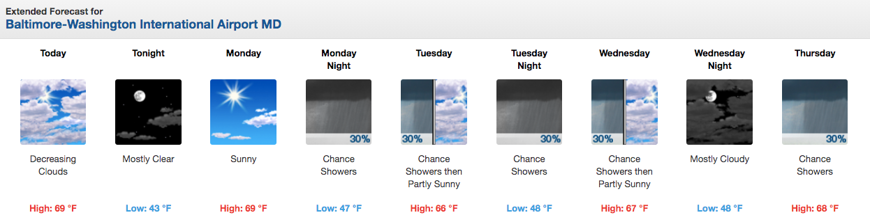 Temperatures will be in the high 60s, topping out around 5 p.m. Sunday, according to the National Weather Service forecast for the Baltimore-Washington area. They will drop to the 40s overnight.