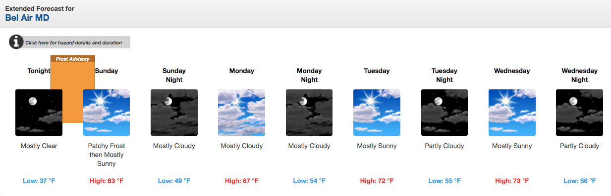 Specifically, the frost advisory said these locations may be impacted: Reisterstown, Cockeysville, Germantown, Damascus, Lisbon and Jarrettsville. In addition to north-central Maryland, the National Weather Service issued the advisory for northern and central Virginia and portions of eastern West Virginia where the growing season is still in effect