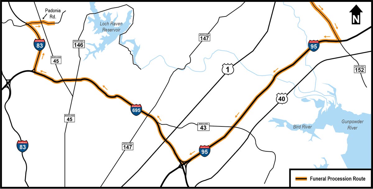 Starting at 11:30 a.m. on Friday, May 25, the funeral procession was set to travel from Mountain Christian Church to Interstate 95, according to the Harford County Sheriff's Office. (It ended up leaving around 1 p.m.)