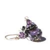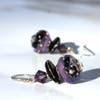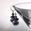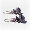 I crafted these stunning earrings from handmade lampwork beads, Swarovski bi-cone beads and sterling silver findings and earwires. The round glass beads were made by an SRA lampwork artist (Self Representing Artist) and feature lovely shades of purple, lavender, plum and black. The dark waves contain little air bubbles that appear to be silver or white- depending on the light. The round beads are kind of donut shaped and measure 12 x 14 mm. The black disc beads were also handmade by an SRA lampwork artist and measure about 12 mm across. They have a string of fine silver droplets around the edge. There are little sterling bead caps as well. A Swarovski crystal bi-cone bead on the top of each earring adds more flash and color!
