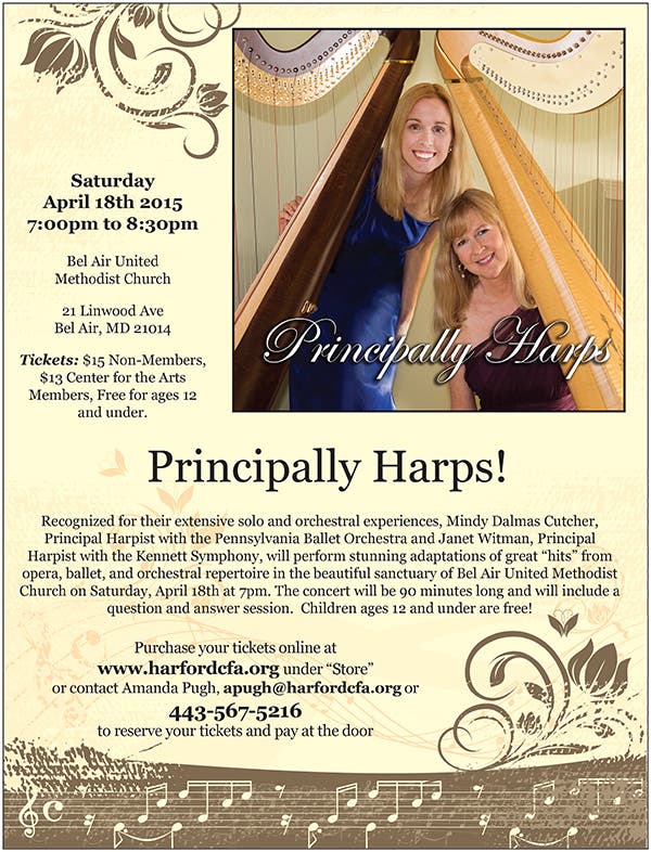 Recognized for their extensive solo and orchestral experience, Mindy Dalmas Cutcher, Principal Harpist with the Pennsylvania Ballet Orchestra and a Bel Air native, and Janet Witman, Principal Harpist with the Kennett Symphony, will perform “Principally Harps!”—a program of stunning adaptations of some of the best-known works from opera, ballet, and orchestral repertoire in the sanctuary of Bel Air United Methodist Church (21 Linwood Ave., Bel Air, Md. 21014) on Saturday, April 18th at 7 p.m.