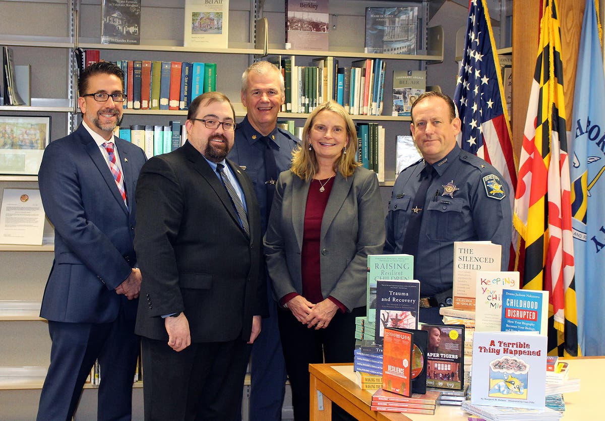 About the Photo: Captain Lee Dunbar, commander, Harford County Sheriff's Office Criminal Investigation Division; Lt. Veto Mentzell, program director, Harford County Child Advocacy Center; Major William Davis, bureau chief, Harford County Sheriff’s Office, Police Operations; and Harford County Sheriff Jeffery Gahler donate books and DVDs to Mary Hastler, CEO, Harford County Public Library, to help raise community awareness about childhood adversity and its negative effects on lifelong health and social outcomes. (Photo courtesy of Leslie Greenly Smith/Harford County Public Library)