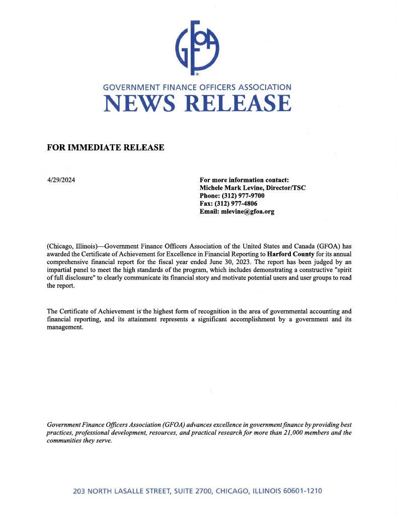 Government Finance Officers Association presents Harford County Government with 39th consecutive Certificate of Achievement for Excellence
