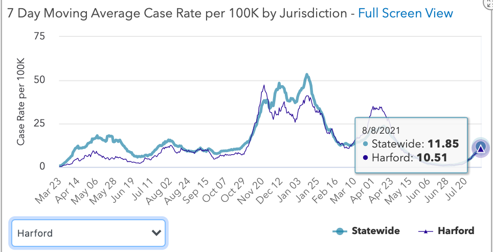 In Harford County, the case rate is 10.51 per 100,000, while Maryland has about 11.85 cases per 100,000, according to state health data released Monday.