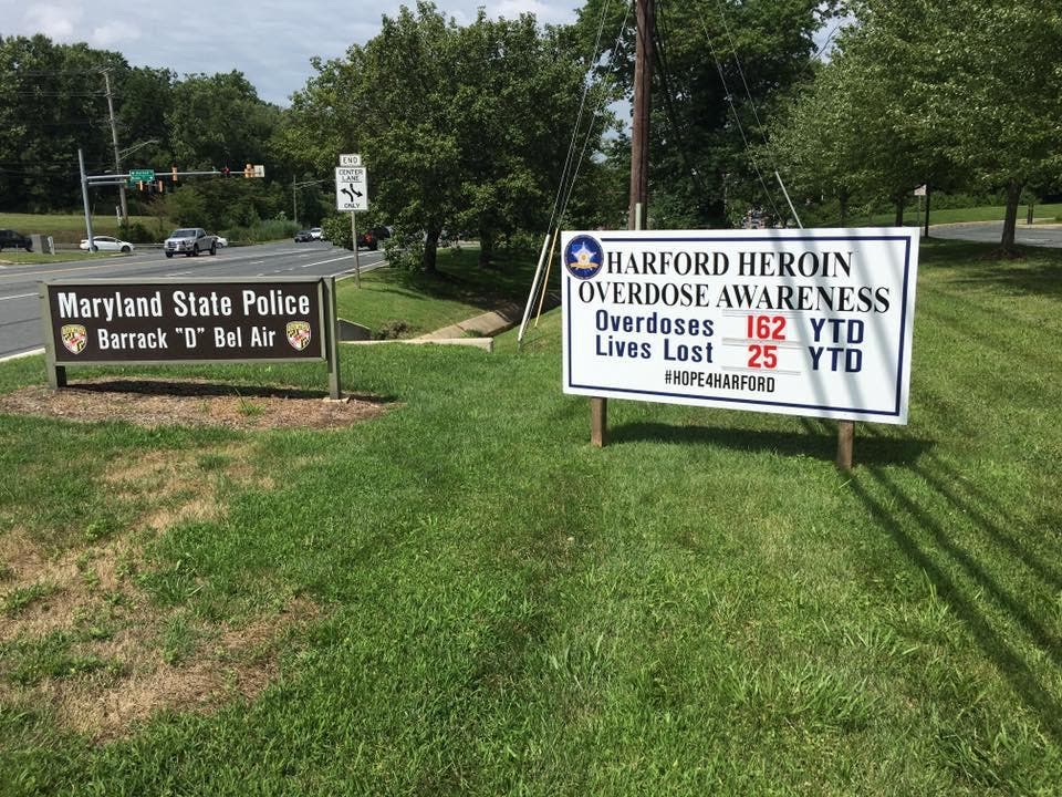 In its ongoing public awareness campaign to combat heroin use, the Harford County Sheriff's Office recently gave Maryland State Police Lt. Tim Mullin, commander of the Bel Air barrack, a sign featuring the latest number of overdoses in the county.