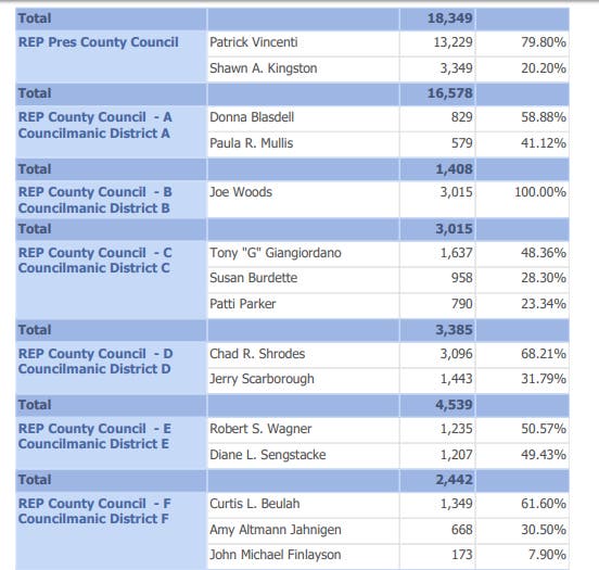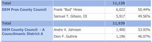 For the County Council, the Democratic nomination for council president is too close to call, with absentee ballots and the provisional ballots still needed for the final tally. Frank "Bud" Hines had 50.44 percent versus 49.56 percent for Samuel T. Gibson III. Incumbent Patrick Vincenti secured the Republican nomination for council president, with 79.8 percent of the vote.