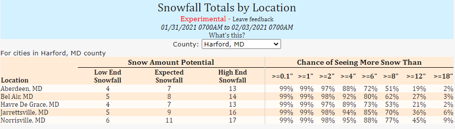 About 6 to 10 inches of snow and 0.1-inch ice are expected to accumulate in Harford County, according to the winter storm warning. Higher amounts could occur in the northern part of the county, where Norrisville may see 11 inches of snow, based on the National Weather Service's projections.