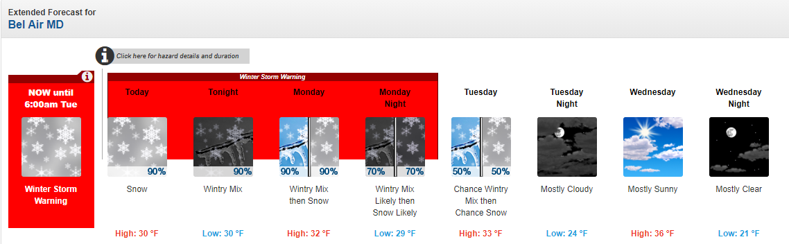 A winter storm warning is in effect for Harford County until Tuesday morning.