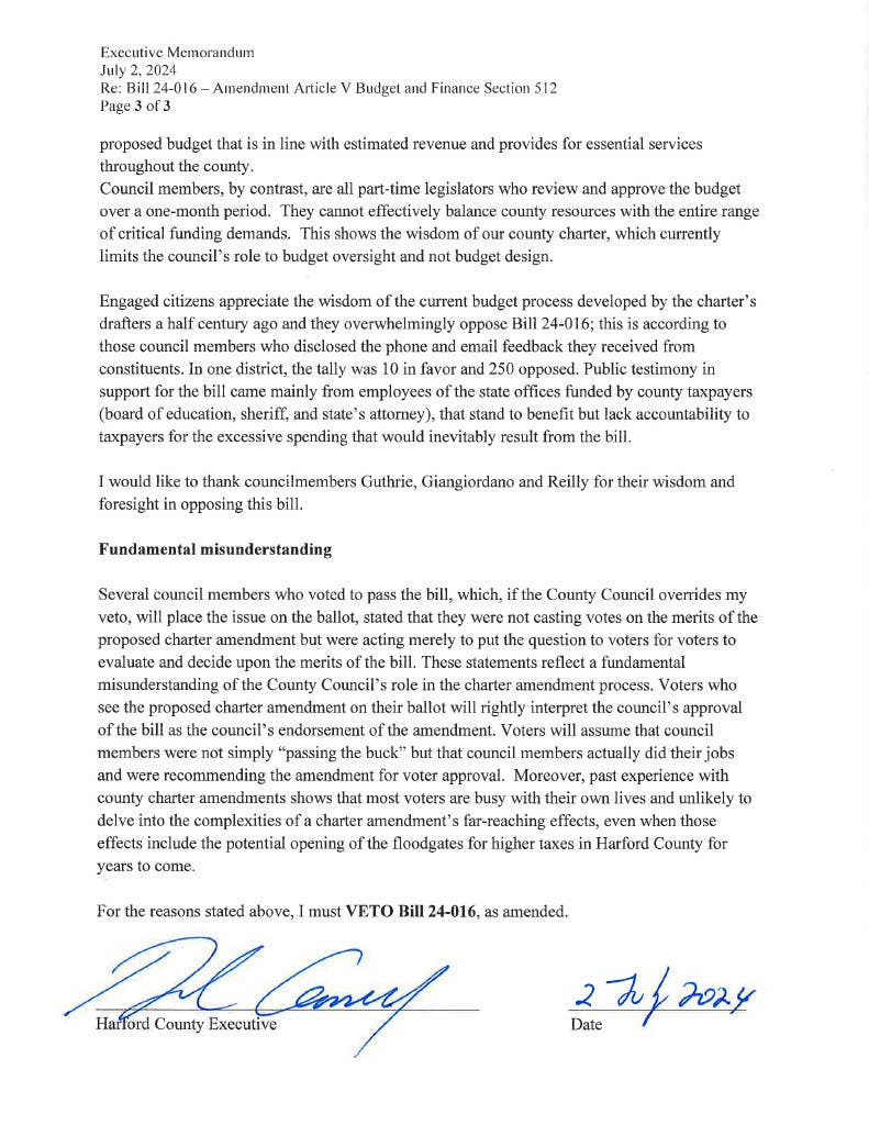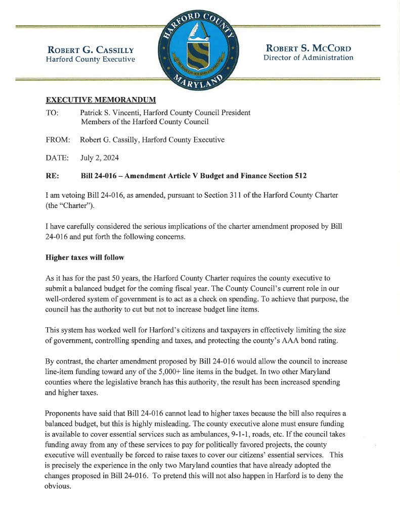 Harford Executive Bob Cassilly today vetoed Bill 24-016 because it will inevitably lead to higher taxes by expanding the spending powers of the County Council.
