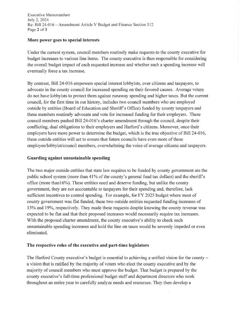 Bill 24-016 was vetoed because it will inevitably lead to higher taxes by expanding the spending powers of the County Council