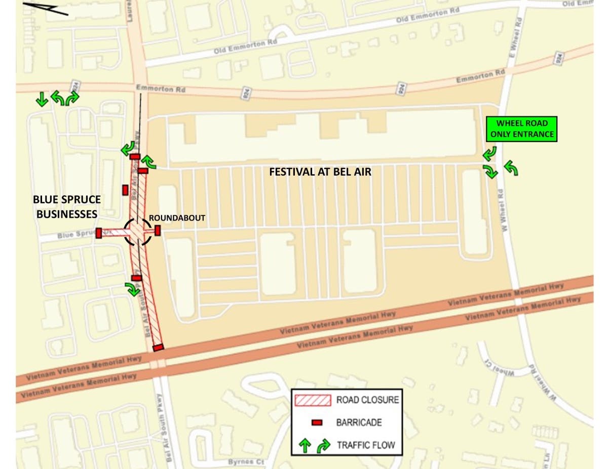 During the closure, there will be no through traffic on Bel Air South Parkway between MD Route 24 and MD Route 924. Limited access to the Festival at Bel Air and other area businesses will be available. Extensive signage will be in place. Motorists are asked to be cautious in the area.