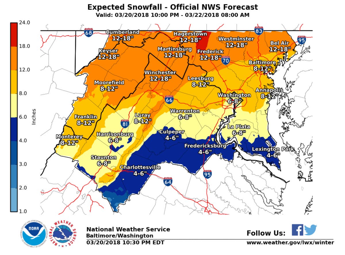 The National Weather Service has issued a winter storm warning from 8 p.m. on Tuesday, March 20, to 8 p.m. on Wednesday March 21. A thin layer of ice overnight may form with up to an inch of sleet/snow. Officials say 10 to 16 inches of snow are expected, with up to 20 inches in higher elevations in north-central Maryland.