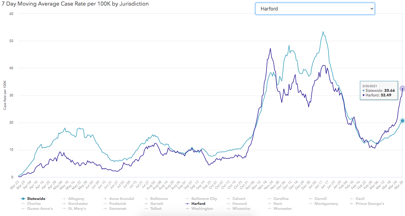 "Our local health officer does not pinpoint one cause or location," Harford County officials said, "other than noting that cases in Harford have not declined as rapidly following holiday peaks vs. other areas of the state."