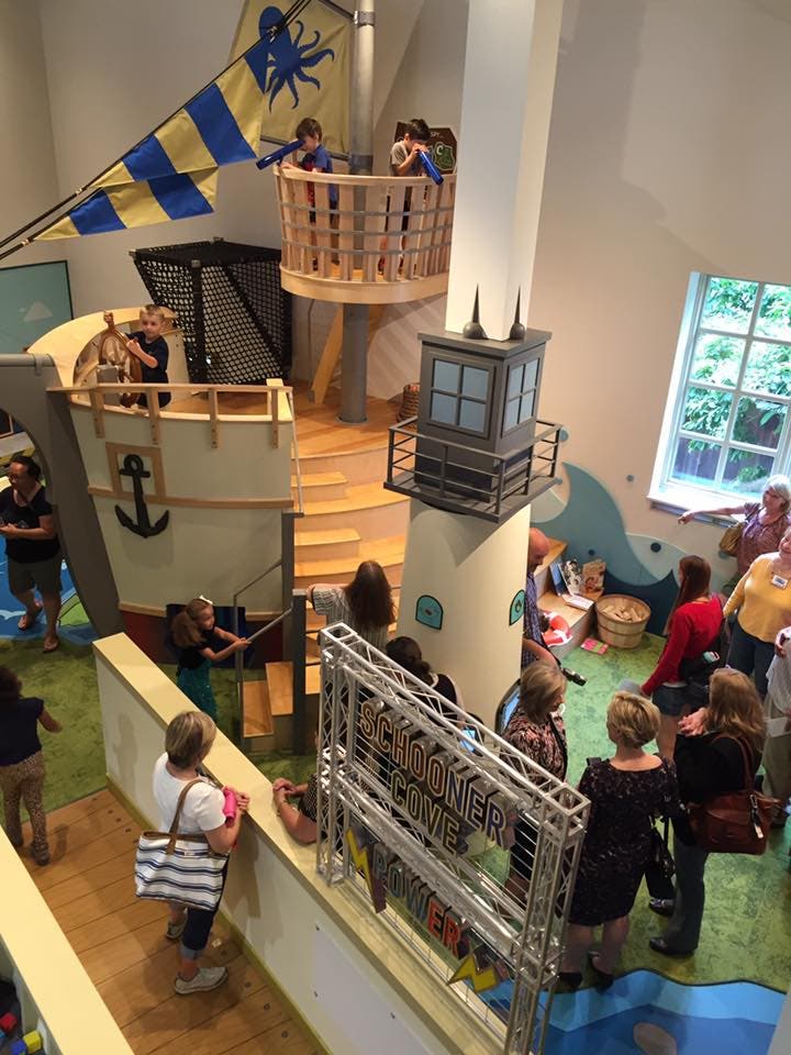 Designed by internationally recognized architect Jim Bradberry of James Bradberry Architects and fabricated by Capitol Museum Services, Schooner Cover also features a shipping yard with technology learning spaces where children can interact with magnets, pulleys and other mechanisms to explore math and physics fundamentals in addition to costume play, gear walls and reading areas large enough for a child and caregiver to interact. Schooner Cover was sponsored by APG Federal Credit Union.