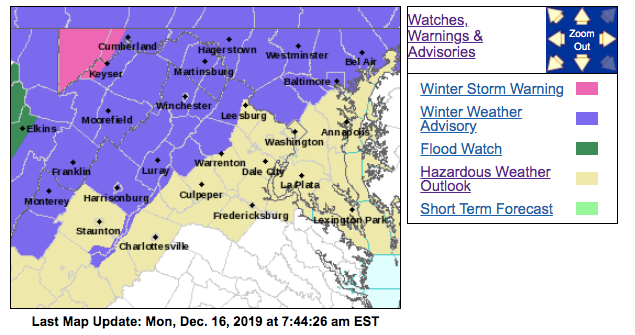A separate winter weather advisory is in effect until 10 a.m. for southeastern Harford, Baltimore, and Howard counties and the city of Baltimore. In these areas, the advisory says a wintry mix is expected, primarily over the western suburbs of Washington and the Baltimore metropolitan area. Up to 1 inch of snow may accumulate.