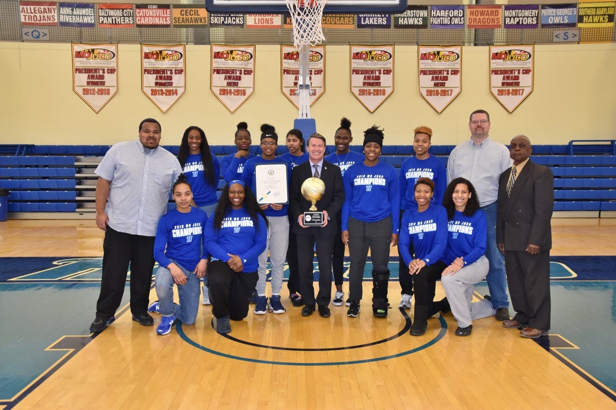 From Harford Community College: Harford County Executive Barry Glassman presented a citation to honor Harford Community College’s men’s and women’s basketball teams recently in the APGFCU Arena at HCC. The Harford Fighting Owls men’s head basketball coach Mike Smelkinson and women’s head basketball coach Mike Seney accepted the citation together on behalf of Harford Community College.