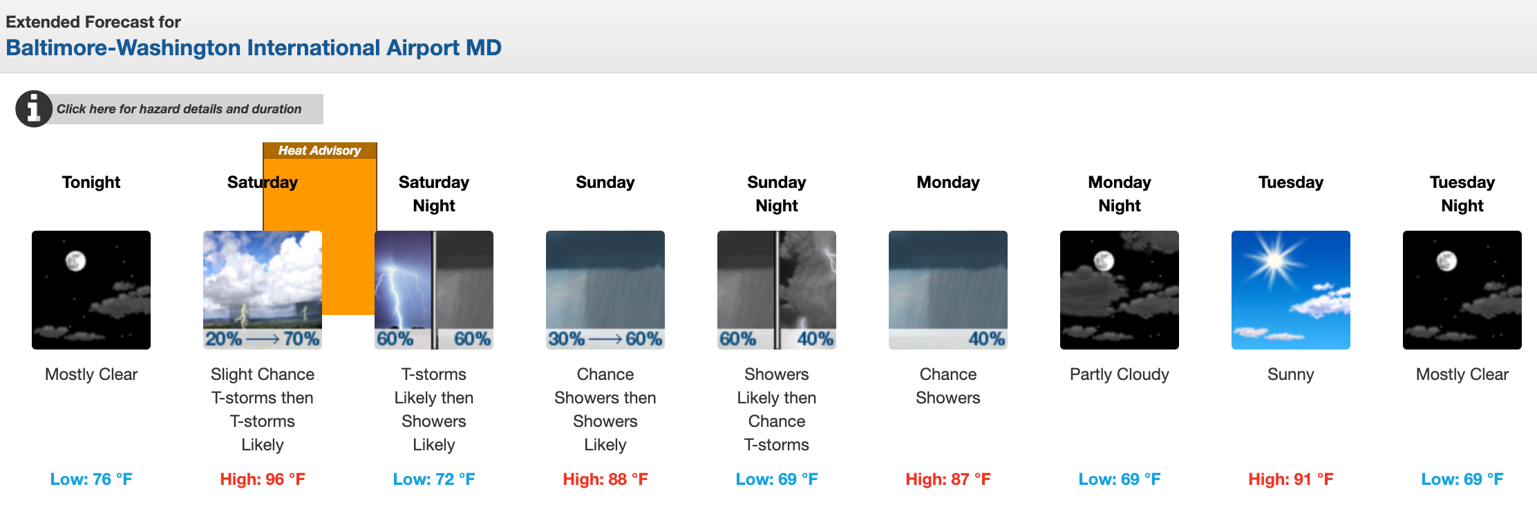 These areas are specifically noted in the heat advisory: Washington, Elkton, Baltimore, Bowie, Suitland-Silver Hill, Clinton, College Park, Greenbelt, Laurel, Camp Springs, Glen Burnie, Annapolis, Severn, South Gate, Severna Park, Arnold, Odenton, St. Charles, Waldorf, Lexington Park, California, Chesapeake Beach, Huntingtown, Dunkirk, North Beach, Lusby, Prince Frederick, Columbia, Ellicott City and Aberdeen.