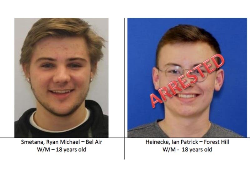 By 2 p.m., Bel Air police said that 18-year-old Ryan Michael Smetana was in custody. His alleged accomplice, 18-year-old Patrick Heinecke, was previously detained.