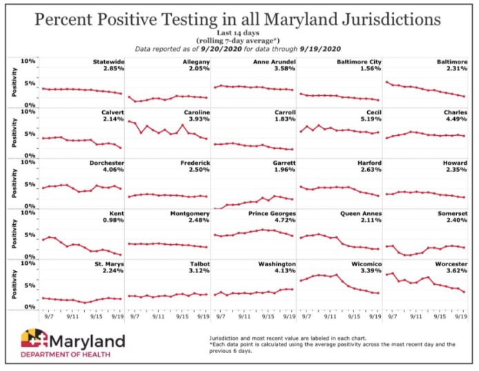 While Maryland health officials report a 2.85 percent positivity rate as of Sunday, Johns Hopkins shows the state has a 4.9 positivity rate as of Saturday, Sept. 19. Hopkins calculates positivity by looking at the number of positive test results divided by the number of people tested. In contrast, the Maryland Department of Health uses positive tests divided by overall tests administered. There is also a time difference in data collection.
