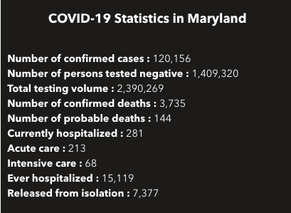 After 412 cases were added to the state's total, Maryland is reporting 120,156 confirmed cases of the coronavirus as of Sunday. With three deaths added, authorities say there have been 3,735 deaths statewide attributed to COVID-19, the disease caused by the coronavirus, since the pandemic began in March.