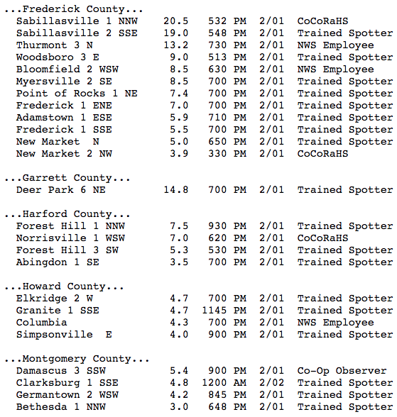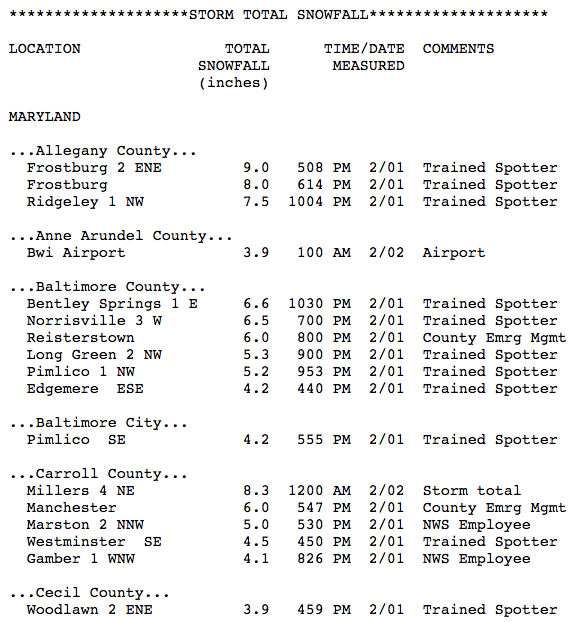 How much snow has fallen so far? See the town-by-town snow totals for Maryland.