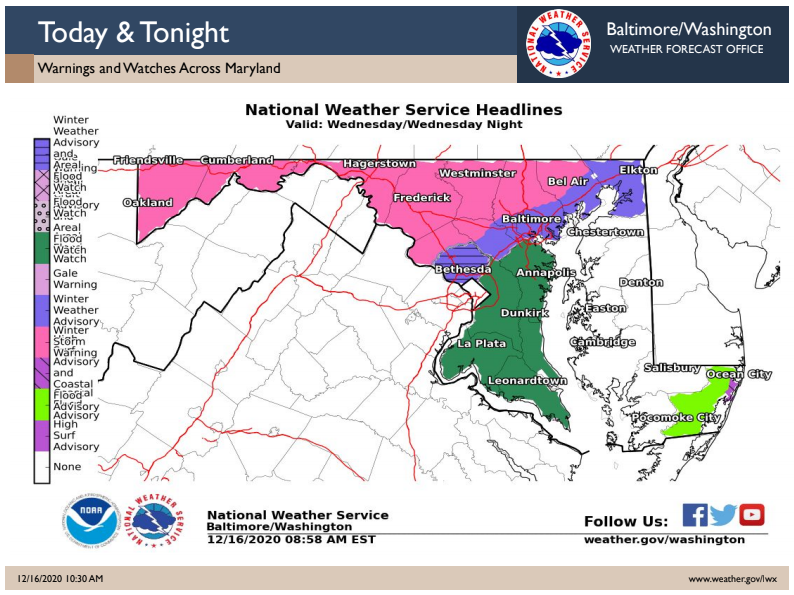 "A switch over to plain rain seems likely along and east of I-95, primarily south of Baltimore and into southern Maryland ... and with the already saturated ground in place, a flood watch is in effect. Isolated instances of flooding will be possible, particularly those flood prone locations," forecasters said. "A potential limiting factor to the flooding threat will be a dry slot working its way into the area late this afternoon and evening."