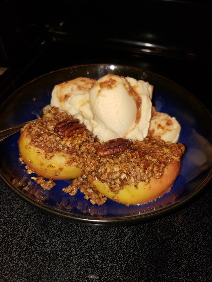- Place in a shallow baking dish, finish covering the apples with nut mixture.