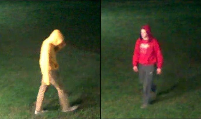 Police released pictures of the individuals accused of breaking into the school, who are wearing long pants and hooded sweatshirts.