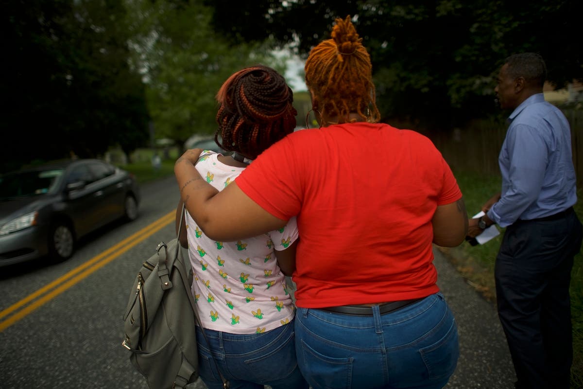 Two women embraced outside the business park. (Photo by Mark Makela/Getty Images)