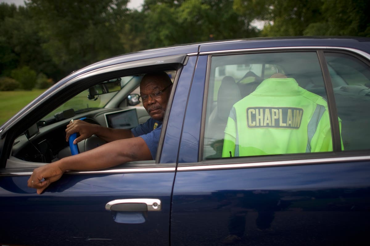 A chaplain drives towards the Rite Aid Distribution Center, where multiple people were killed and injured. (Photo by Mark Makela/Getty Images)