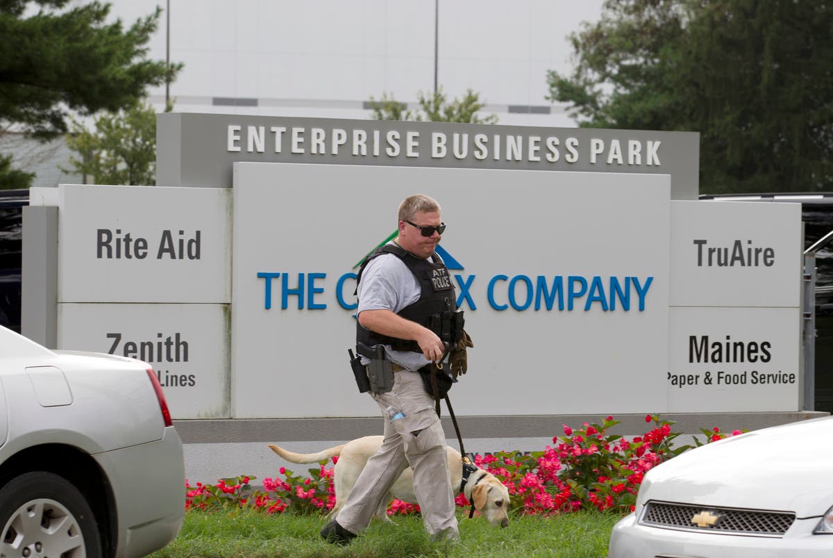 Main image: Police officers gather below crime scene tape in front of a Rite Aid Distribution Center where multiple people were killed and injured in a shooting on Sept. 20, 2018, near Aberdeen. A woman opened fire at the business center killing three and wounding three others. The suspect died of a self-inflicted gun shot wound. (Photo by Mark Makela/Getty Images)