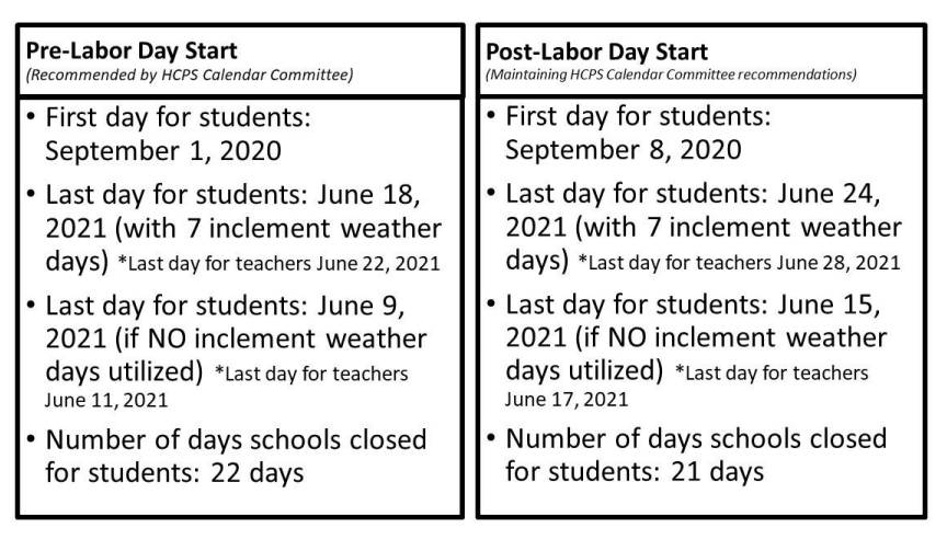 The final day of classes would be June 9, 2021, and if all seven inclement weather days were used, then the school year would end June 18, 2021, according to the proposed calendar.