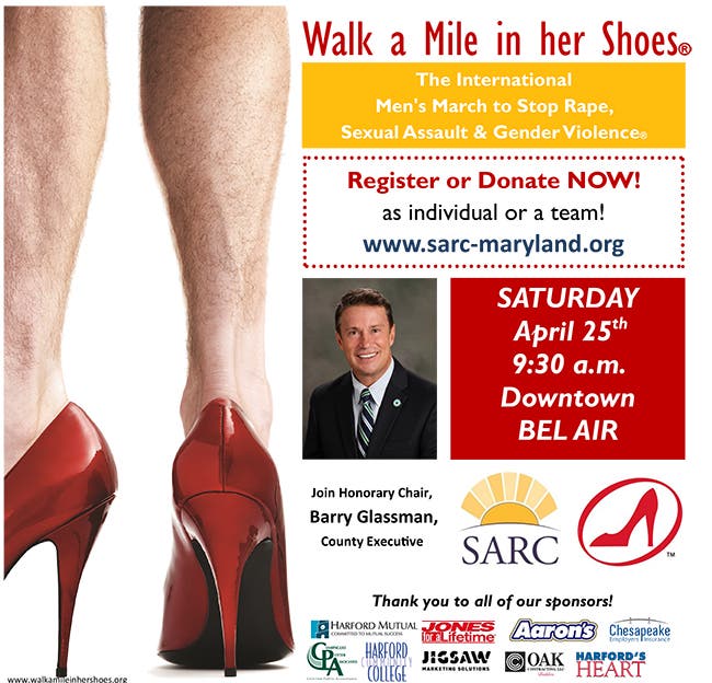 SARC’s Walk a Mile in Her Shoes® event begins at 9:30 a.m. with onsite registration at 10 a.m. Kickoff announcements and fundraising awards will begin at 10:30 a.m. The actual walk begins at 11 a.m. in downtown Bel Air.