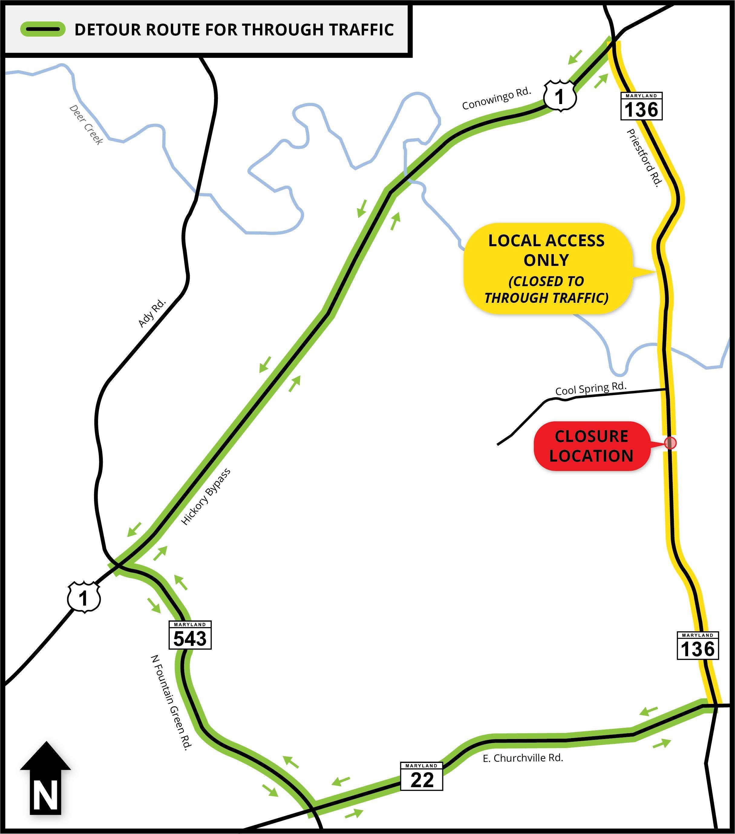 A 12-mile detour route will be posted on state highways including Conowingo Road, the Bel Air Bypass, Route 543/Fountain Green Road and Route 22. (See the map at the bottom of the article.)