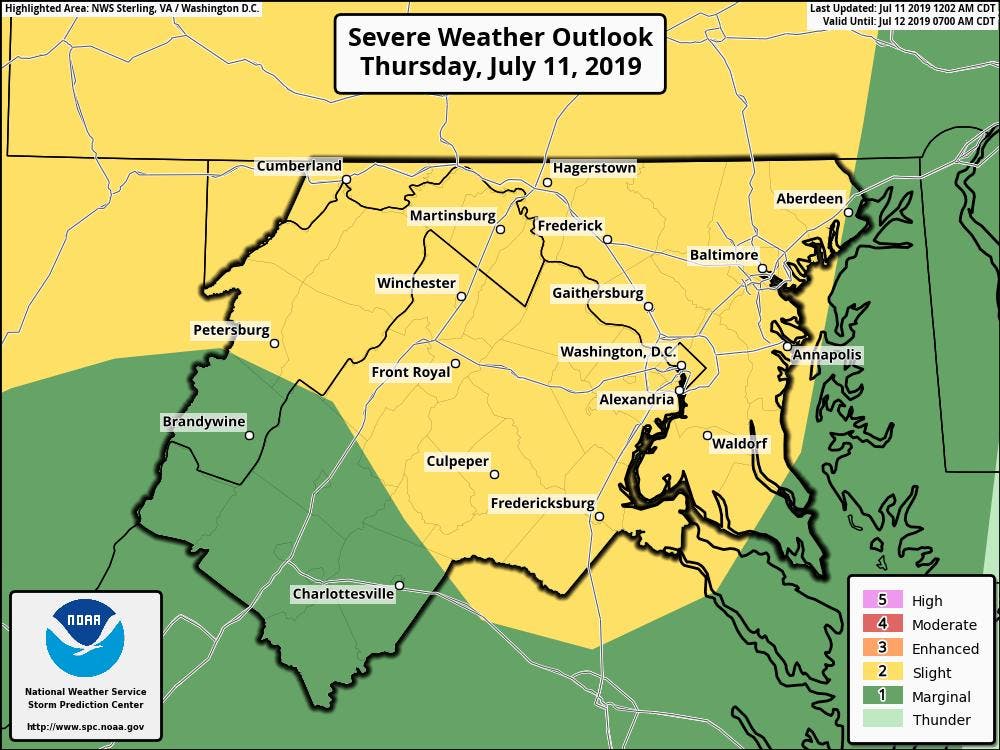 Additionally, a line of showers and storms is approaching from the west. Damaging winds and heavy rainfall, which could lead to flash flooding, are the main threats for the day. The National Weather Service has issued a flash flood watch for parts of the region from 2 p.m. through 2 a.m. Friday. This applies to all or portions of Anne Arundel, Calvert, Carroll, Howard, Montgomery, Charles, Baltimore, Harford, Cecil, Prince George's, and St. Mary's counties.