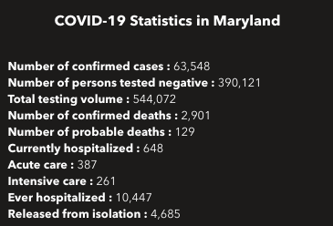 Since the pandemic began in March, state health officials say more than 544,000 coronavirus tests have been administered across Maryland, and more than 10,000 people have been hospitalized with the virus. Nearly 4,700 have been released from isolation. A total of 2,901 people have died from the coronavirus, state health officials reported Friday.