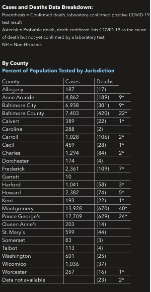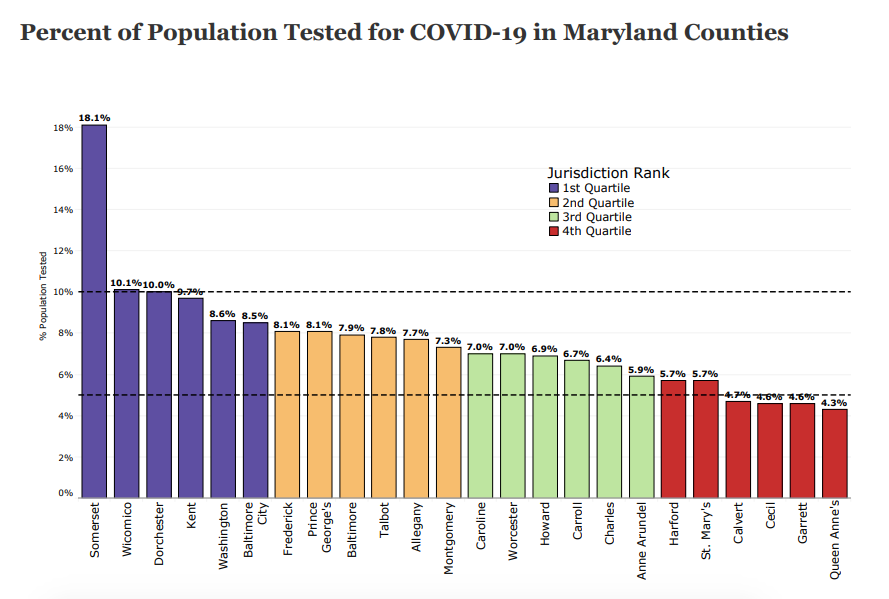 He released a graph showing what percentage of the population had been tested in each jurisdiction. Somerset County leads the way in testing, with 18.1 percent of its population tested, while Queen Anne's County is last at 4.3 percent.